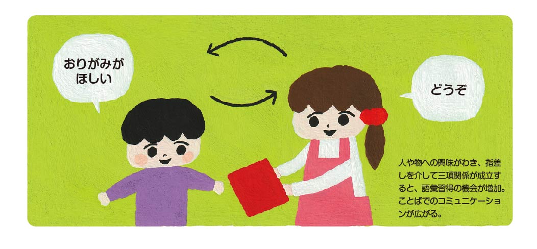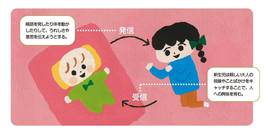 コミュニケーションは「受信」と「発信」のくり返し 三項関係がターニングポイントに ここでは、コミュニケーションは「受信」と「発信」から成り立つと定義し、この2つを分けて考えてみましょう。コミュニケーションの力はこの2つをくり返すことで発達していきます。新生児は大人の視線や表情を「受信」し、笑ったり泣いたり、喃語を発したりすることで「発信」します。生後約8か月頃からは人見知りをし、親しい大人以外とはやりとりがうまくいかない時期もありますが、「親しい人」と「自分」の二項関係から、「自分」と「他者」が同じ対象物を見ながらやりとりをする三項関係に広がり、ことばも増えていきます。 |