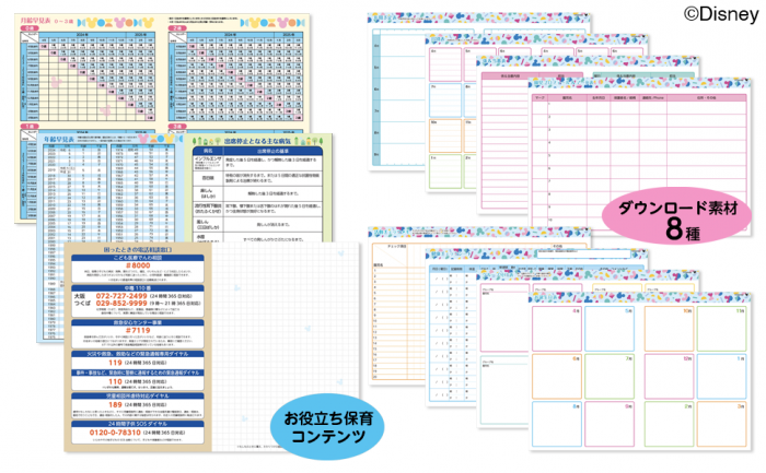 月齢早見表(0~3歳)、年齢早見表(0~100歳)、出席停止となる主な病名リスト、子どもの体調の急変など緊急時の電話相談窓口リスト