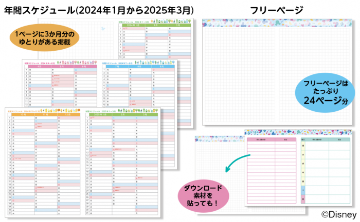 年間スケジュール表(5ページ/2024年1月~2025年3月)は1ページに3か月分のゆとりのある掲載なので、予定の書き込みがしっかりできます。 フリーページ(24ページ)は大容量!12見開き分あるので、各月ごとに分けて使うこともできます。